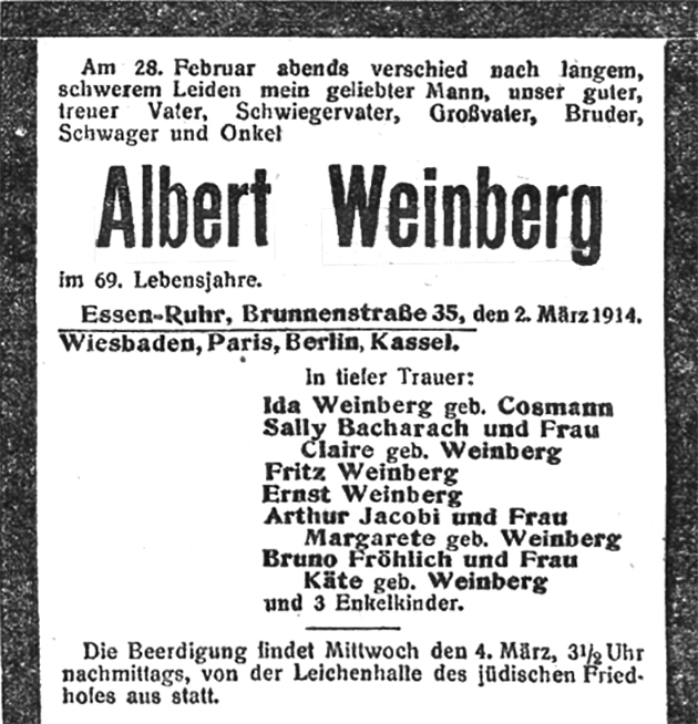 Fritz Weinberg kam am 30. Dezember 1880 als Sohn von Albert Weinberg (1845 – 1914) und Ida Weinberg (1852 – 1918), geborene Cosmann, in Essen zur Welt. Fritz hatte noch vier weitere Geschwister: eine Zwillingsschwester, Claire Lehmann, geborene Weinberg (30.12.1880 – 25.11.1941), einen Bruder, Ernst Weinberg (13.5.1882 – 9.5.1941) und zwei Schwestern: Margarete Jacobi, geborene Weinberg (13.9.1885-14.5.1963) und Bertha Katinka (Käthe) Fröhlich, geborene Weinberg (25.10.1886 – 14.5.1942).