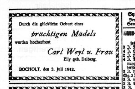Elly Weyl und ihr Mann nahmen 1935 die ersten jüdischen Mieter in ihr Haus auf. Am 1. Juni 1935 zog das Ehepaar Isidor und Berta Herz ein. Wenige Tage später heiratete Ellys Bruder Rudolf in Berlin. Seine Frau Hildegard war keine Jüdin. Währenddessen absolvierte ihre Tochter Erna in Berlin eine Ausbildung zur Säuglingsschwester. Möglicherweise hatte ihr Schwager, der Kinderarzt Dr. Julius Weyl, sie zu dem Beruf inspiriert.