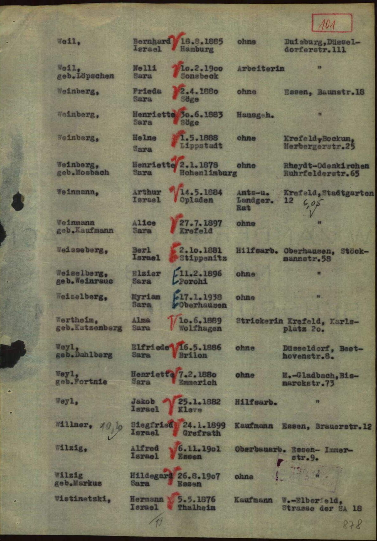 Im Januar 1940 zog Elly Weyl aus dem Haus Lindemannstraße 35 in die Beethovenstraße 8. Etwa um die gleiche Zeit zogen alle anderen jüdischen Mietparteien aus. Vermutlich wurde das Haus in dieser Zeit (zwangs)verkauft. Elly Weyl lebte in ihrer neuen Unterkunft noch etwa zwei Jahre. Sie beantragte einen Paß, um vermutlich zu ihrer Tochter nach Amerika auszuwandern.