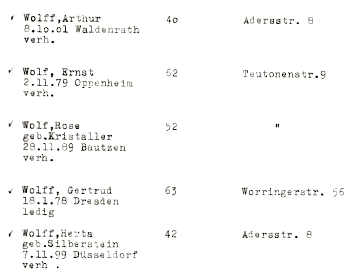 Arthur Wolff zog 1941 nach Düsseldorf in die Adersstraße 8. In diesem Haus wohnte seit 1939 auch Herta Silberstein. Die beiden wurden ein Paar und heirateten 1941.